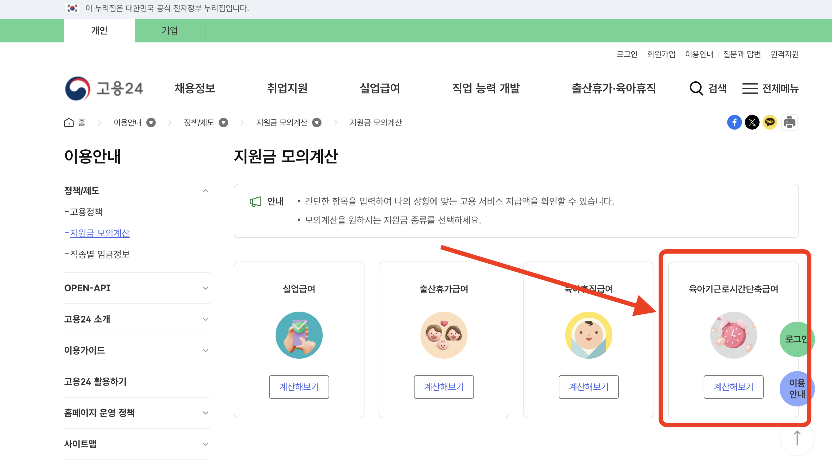 Work24 육아기 근로시간 단축급여 모의계산 바로가기