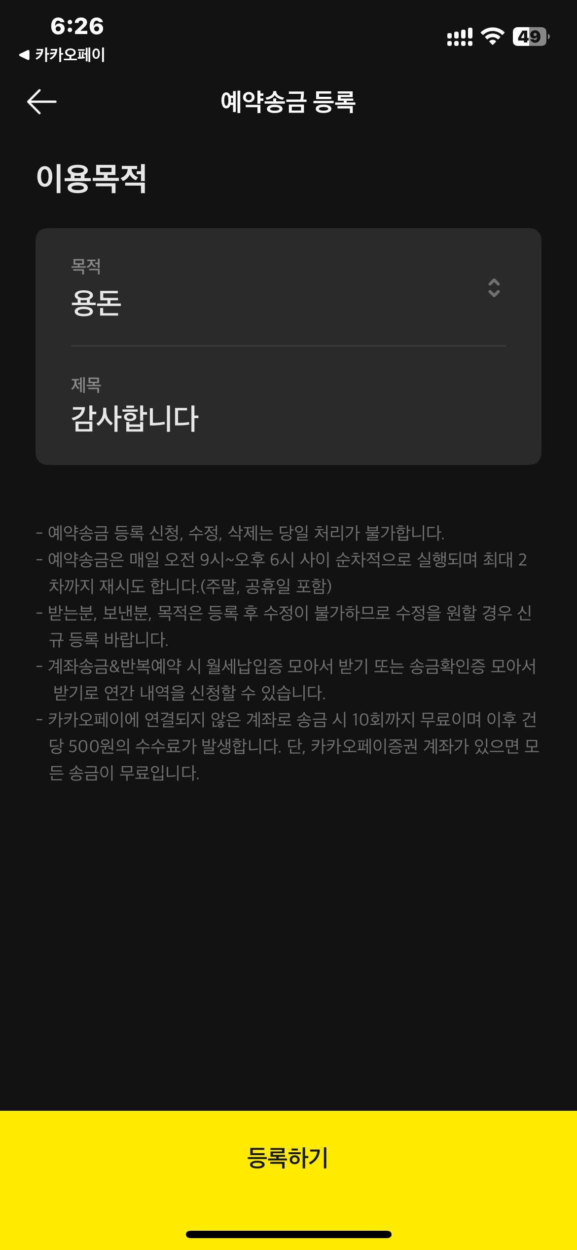 카카오페이 앱의 예약송금 기능은 정말 간단하면서도 실용적입니다.